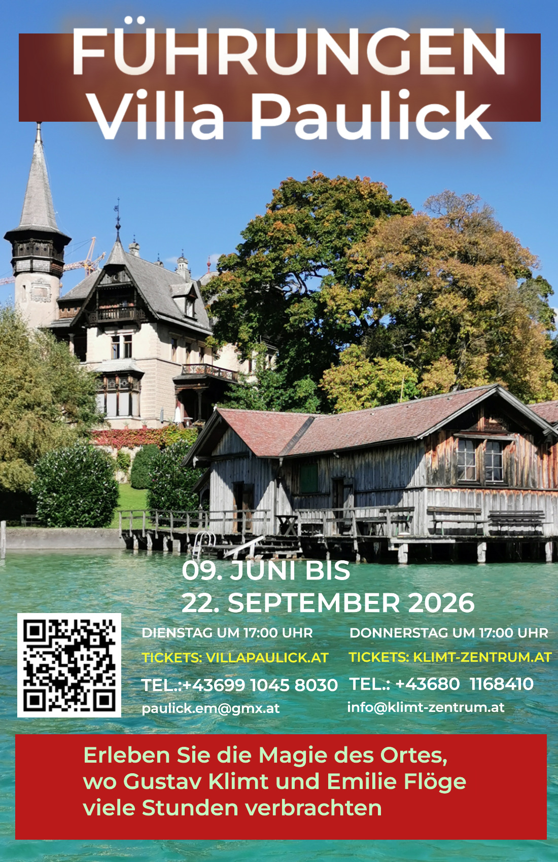 in Zusammenarbeit mit dem Klimt Zentrum jeweils Donnerstag 17:00 Tel.: +43 680 1168410 oder info@klimt-zentrum.at - eine Kombination mit der Besichtigung des Museums in Schörfling und dem Themenweg ist möglich